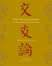 If you enjoy maxims or reflecting on how to sustain healthy friendships, then Timothy Billings’ translation of Matteo Ricci’s On Friendship: One Hundred Maxims for a Chinese Prince (Columbia UP, 2009) will appeal to you. Written in 1595, the book helped Ricci – a native of Macerata, Italy – make friends and (as Billings says in his extensive and thorough introduction) “forge meaningful cultural connections between Europe and China.” A Christian missionary living in China, Ricci composed the book in Chinese and, within a year of the book’s composition, friends and acquaintances began printing copies, quickly – as Billings writes – “turning it into the late Ming equivalent of a best seller.”