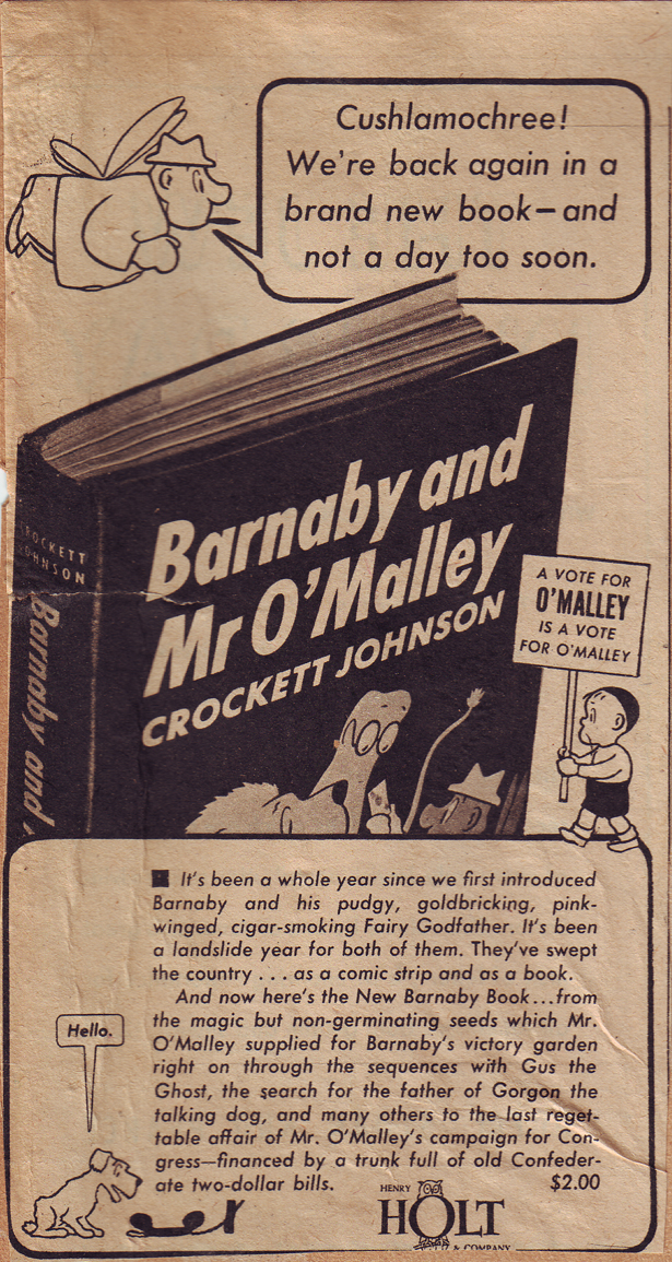 104 years ago, David Johnson Leisk was born in New York City. Â For his pseudonym, he would later add his childhood nickname “Crockett” to his middle name… becoming “Crockett Johnson.” Â Below is an ad for the second collection of the comic strip that made him famous: Barnaby (1942-1952).