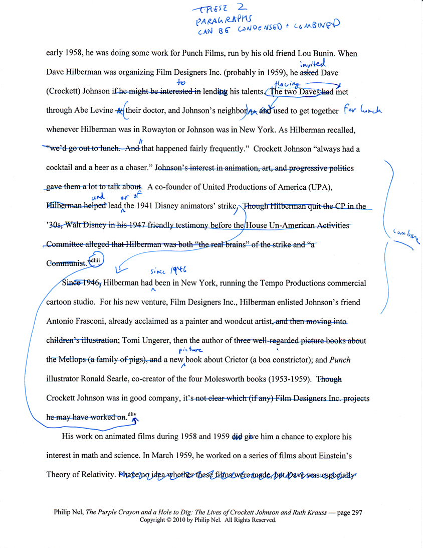 For those readers (2 readers? 3? any takers?) who find these posts marginally more fascinating than watching paint dry, here’s a page from the just-edited Chapter 22 of my The Purple Crayon and a Hole to Dig: The Lives of Crockett Johnson and Ruth Krauss (forthcoming from the University Press of Mississippi, 2012). Â For the record, the barely legible handwritten editorial notations are all mine.