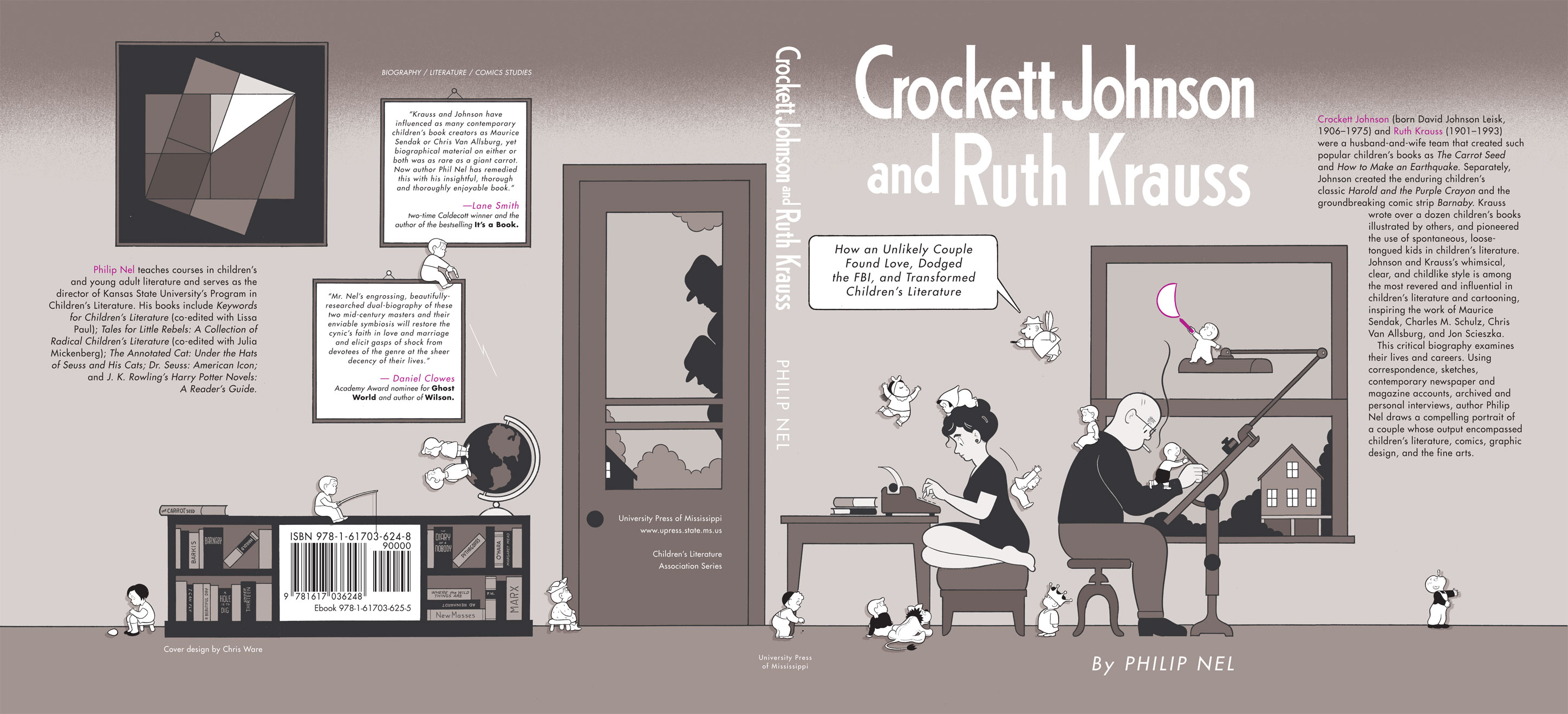 We’d be glad to sign your copy of the book. Or not. It’s up to you, really.  Or we could just chat.  What? Stopping by to chat about Crockett Johnson, Barnaby, and Mr. O’Malley isn’t enough for you?  Well, you could also purchase one of Chris Ware’s limited-edition posters for my Eisner-nominated book, Crockett Johnson and Ruth Krauss: How an Unlikely Couple Found Love, Dodged the FBI, and Transformed Children’s Literature (2012).  The actual full, wrap-around cover is below: click to enlarge. Seriously: click it. It’s beautiful.  Mr. Ware’s specially designed poster version (measuring 20″ x 39″) removes the blurbs (replacing them with two more Johnson paintings), and removes all other text save for the title (on the front cover) and my name (on the front cover).