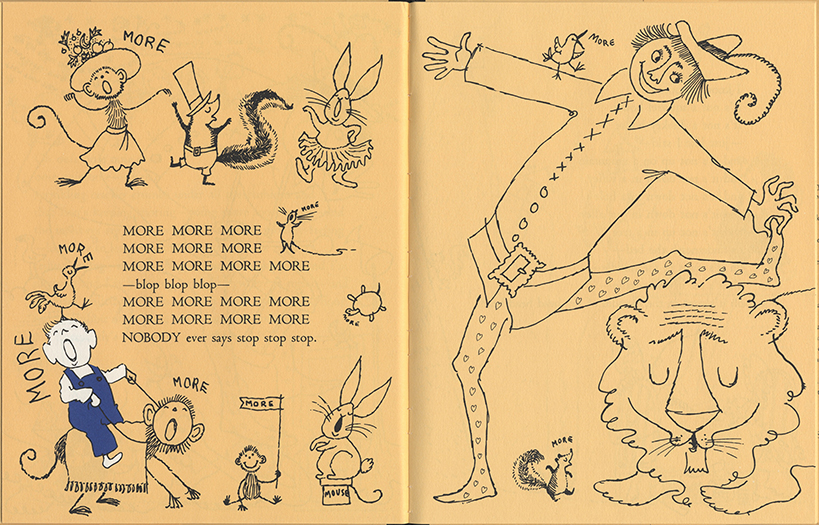 One reason that people respond to Max as if he and his adventures were real is that Sendak also learned from Krauss to “keep it real.” As he said, Krauss’s “The Carrot Seed, with not a word or a picture out of place, is dramatic, vivid, precise, concise in every detail. It springs fresh from the real world of children, the Bank Street world of listening to children and recording and re-creating their startling speech patterns and curious, pragmatic thinking processes” (“Ruth Krauss and Me” 286). He’s wrong about the book’s composition: The Carrot Seed (1945) derived from Krauss’s imagined conversation with a 5-year-old neighbor. But he’s right about Krauss’s compositional methods during the period she worked with him. Beginning with A Hole Is to Dig (the first book of hers that he illustrated), Krauss used children’s spontaneous utterances in her books.