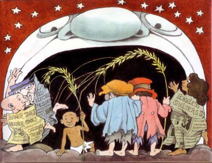 Maurice Sendak, We Are All in the Dumps with Jack and Guy (1993)Granting us access to that “inner life,” the faces of Sendak’s characters telegraph their emotions. In Where the Wild Things Are, Max’s face conveys a full range of emotions – anger (at his mother), joy (as he sets sail on the boat), imperiousness (as he becomes king of the wild things), and melancholy (when he longs for home). When he gets home, his light smile and half-closed eye conveys contentment. But many of Sendak’s later books do not end quite so happily.  As the rat tries to carry him off stage right, the “poor little kid” in We’re All in the Dumps with Jack and Guy (1993) has a black eye, and his mouth open to cry out – likely the word “help,” the sole thing he utters in the book (five times in all). To the left of him, “THE MOON’S IN A FIT”: an angry-faced moon has lifted Jack and Guy up by their newspaper robes; their feet dangling over the ground and their mouths downturned, the boys’ eyes look out at the reader, uncertainly. Just left of them, the other homeless children flee off to the left of the page, defying the typical left-to-right movement across the page.  It’s an unsettling scene in a book that ends with children only temporarily safer, sleeping in a sidewalk shantytown. The ending of Outside Over There is ambivalent at best. Armed only with a “wonder horn,” Ida travels into “outside over there,” defeats the goblins with her music, rescues her younger sister and brings her home to mother. However, as playwright Tony Kushner observes, “The reunion of Ida and her sister with their mother at the end of Outside is reassuring, though … Sendak has taken pains to limit that comfort”: the baby is tearful, and Ida and her mother “look resigned rather than joyful at the news that their absent husband/father will return ‘one day,’ which is not, of course, especially reassuring news – when, exactly?” (The Art of Maurice Sendak Since 1980 22).