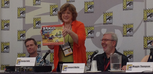 Moderator Mark Evanier (Groo the Wanderer) said that they had such a good time celebrating Walt Kelly’s 100th birthday last year that they wanted do it again. Indeed, “If they keep letting us do this, we’ll do Walt Kelly’s 102nd birthday, 103rd birthday, 104th birthday… until he comes back.”