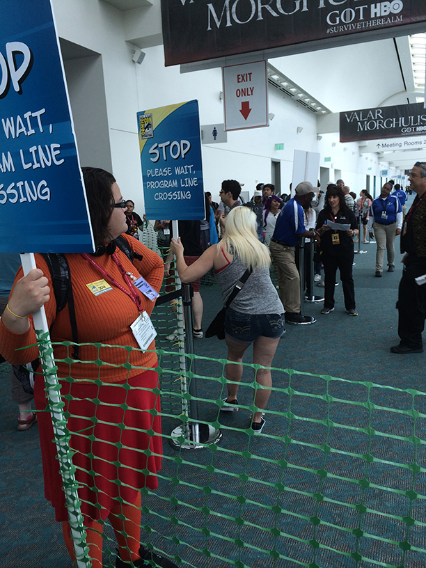 From the “signing,” it was off to the Eisner panel! Almost. Got held up during a program line crossing. For the panels with masses of people lining up to get in, the lines snake up and down, around the building, and on and on. Â So,… when they finally get to enter, that’s a long line of traffic. Comic-Con volunteers act as traffic cops, and ask us to wait while the maddening crowds pass us by.