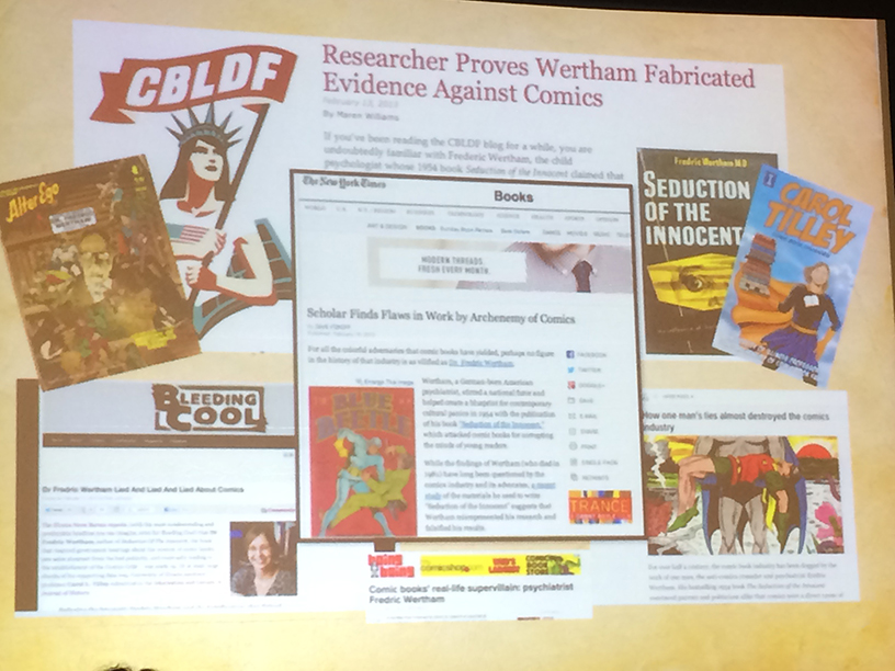 In a dynamic, well-illustrated presentation, Carol Tilley showed us the most absurd and most damning facts about Fredric Wertham’s anti-comics crusade. Specifically, Wertham faked his facts. He falsified his “evidence,” and twisted the stories of his subjects. In so doing, he not only made flawed arguments but lacked the professional ethics required of a researcher.