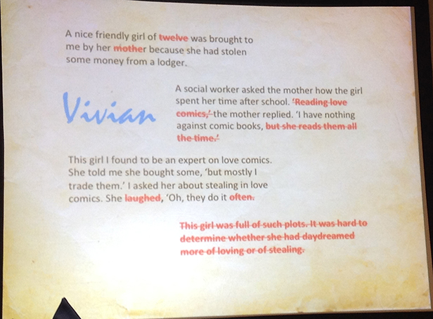 Vivian was 13, not 12. She was African-American. Her report card was excellent. We learn that her mother was actually her stepmother, and had revoked Vivian’s allowance. In fact, her mother confirmed that Vivian was more enthralled by television. In the slide below, Tilley shows some of the bits that Wertham invented – those parts are in red and struck through.