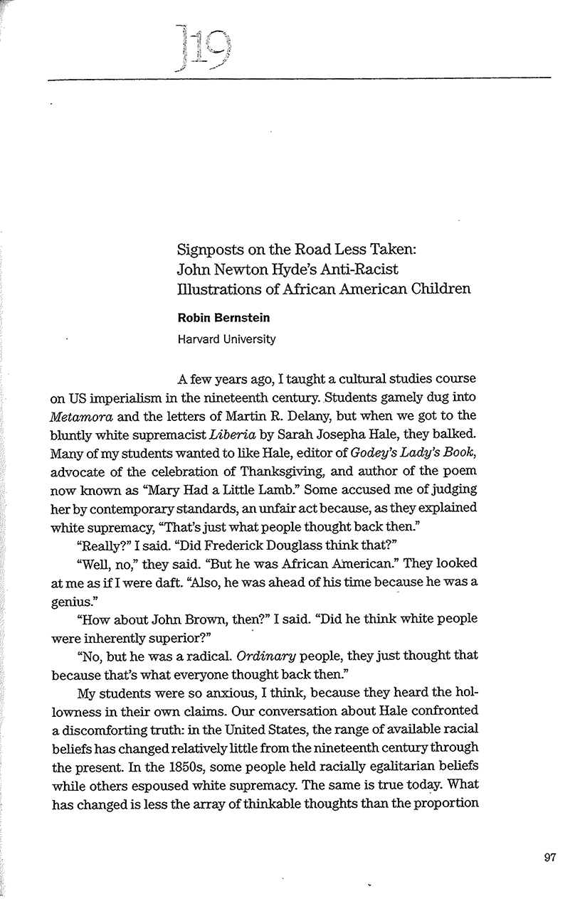 - “Signposts on the Road Less Taken: John Newton Hyde’s Anti-Racist Illustrations of African-American Children,” The Journal of Nineteenth-Century Americanists 1.1 (Spring 2013): 97-119.