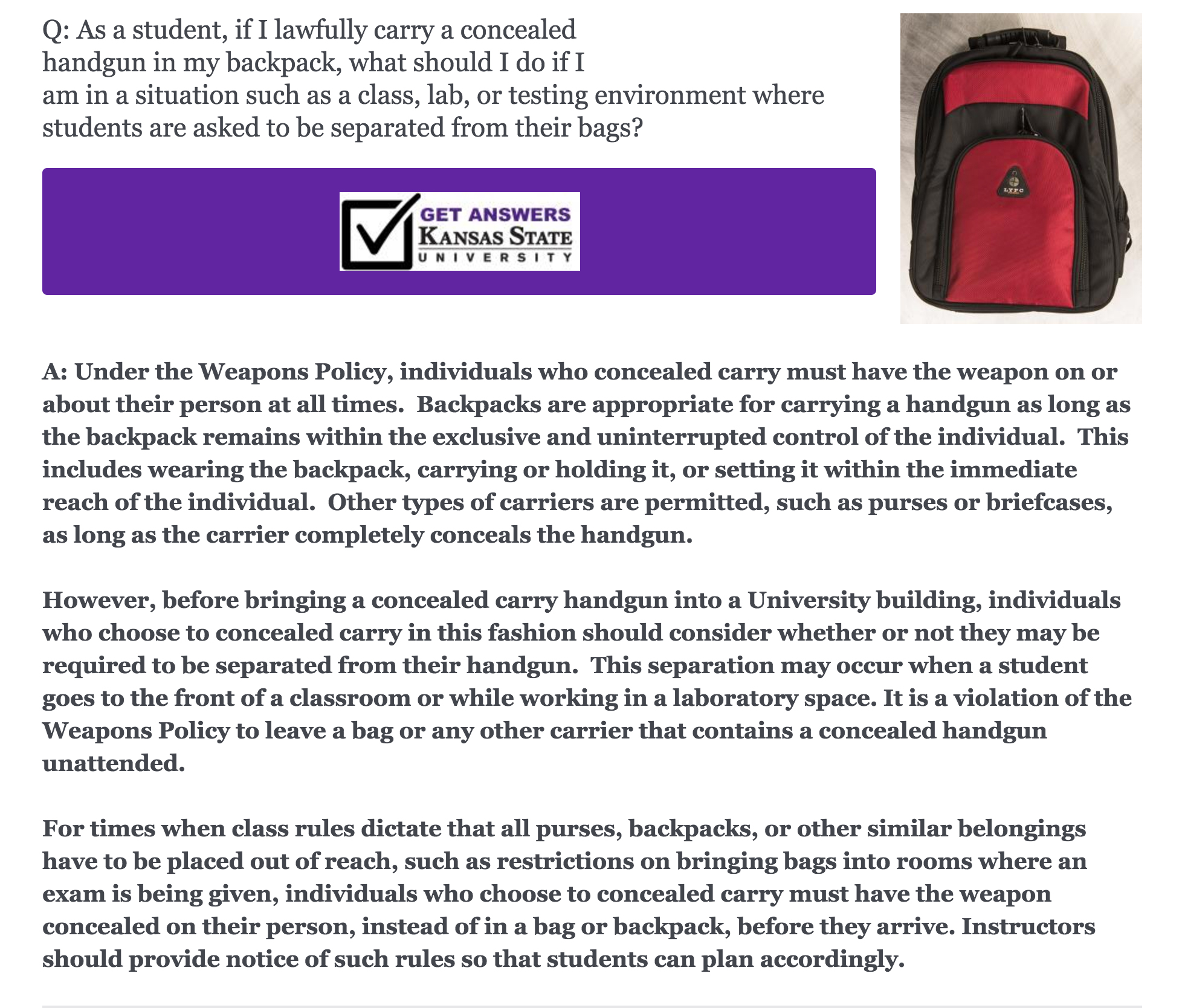 On July 1, the university’s exemption from the concealed carry requirements of the Personal and Family Protection Act expires, meaning that the concealed carry of handguns will be allowed in university buildings at Kansas State University and other state universities. K-State continues its commitment to the safety of students, faculty and staff and all members of the K-State community.