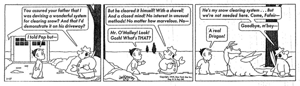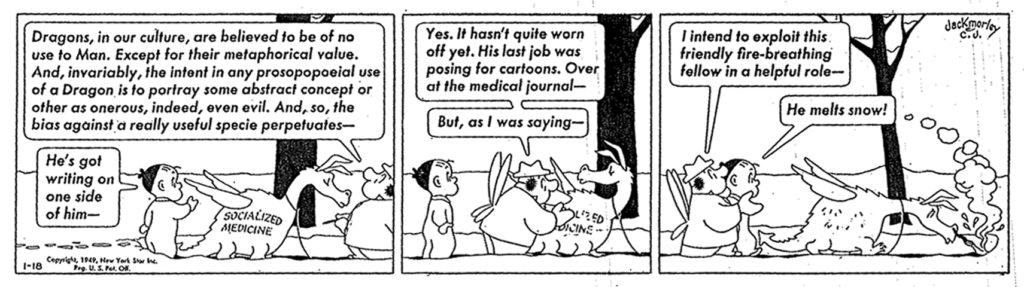 SOCIALIZED MEDICINE (18 Jan.). Johnson was a strong advocate for national health care. In support of the Wagner-Murray-Dingell Bill (which appeared in several versions between 1943 and 1946), he even illustrated For the People’s Health (1946) – the Physicians Forum’s pamphlet advocating for passage of the bill. That effort failed. President Truman’s surprising election in 1948, which included restoring the Democratic Party’s control of Congress, seemed to augur well for the creation of a National Health Insurance System. As would later be the case in America’s most recent debates on the subject (2009-2010s), opponents caricatured socialized medicine as a dangerous government takeover of health care that would deprive doctors of freedom and limit patients’ choices of physician. The month prior to this strip’s appearance, the American Medical Association retained a publicity firm to continue its campaign to (in the words of its general manager) “alert the American people to the danger of a politically controlled, compulsory health system” (“Medical Association Moves Against Socialized Medicine”). Johnson here refers to political cartoons that caricatured socialized medicine as a dragon.