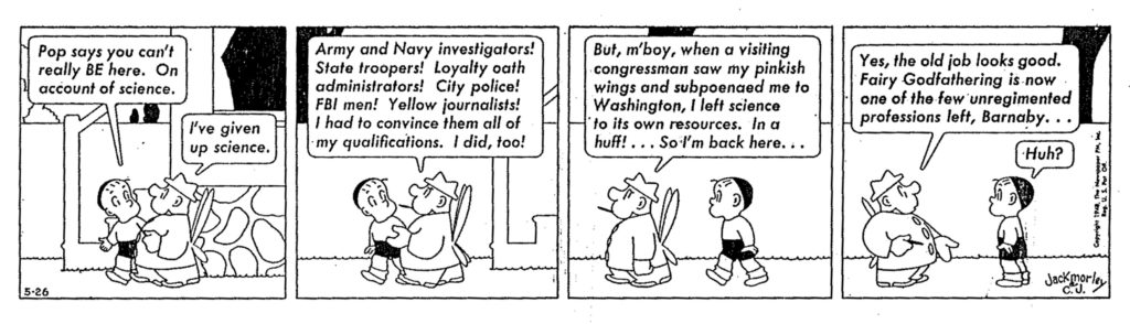 What do you do when the political culture shifts, exchanging hope for fear, abandoning evidence to embrace innuendo? Crockett Johnson faced this question when, in September of 1947, he returned to writing Barnaby. He and his characters inhabited a different landscape than they had at the end of 1945 – when Johnson gave up his role as the strip’s sole creator and, for twenty months, served primarily in an advisory capacity. As Anti-Communism replaced the Popular Front, his support for progressive causes now marked him not as a patriot, but as a person of interest. In 1948 and 1949, his comic strip is less directly confrontational, and – though there are moments of specific, acerbic satire – typically gestures towards this new culture of paranoia indirectly, such as when O’Malley observes (in August of 1949), “Barnaby, your Fairy Godfather sometimes wonders about people. How they can believe in Sea-Serpents is beyond me.” After all, there’s “not one shred of scientific evidence to prove that Sea-Serpents exist.” Or, in November of that same year, O’Malley says, “I’ll never understand, m’boy, how intelligent people like your parents can make these broad generalizations about Pixies. Or people– There are good Pixies and bad Pixies. Just as there are good people and bad people.” Pixies are not Communists, and Sea-Serpents are not Progressives. (Johnson was affiliated with the Progressive Party in the 1940s and the Communist Party in the 1930s.) But it’s notable that O’Malley presents both as examples of poor reasoning, or of assuming that each individual embodies all characteristics of an entire group. The illogic has real-world parallels, even if the metaphor lacks a specific real-world referent. During 1948 and especially 1949, Barnaby moves towards expressing its politics mostly (though not exclusively) through metaphor. This choice is notable because these years provided what might otherwise have been irresistible targets for Johnson’s satire.