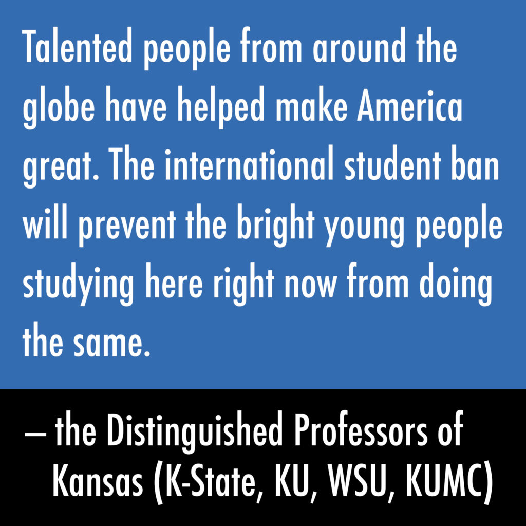 In our private capacity as university distinguished professors at Kansas State University and the University of Kansas Medical Center, and distinguished professors at the University of Kansas and Wichita State University, we ask that you revoke the student ban.