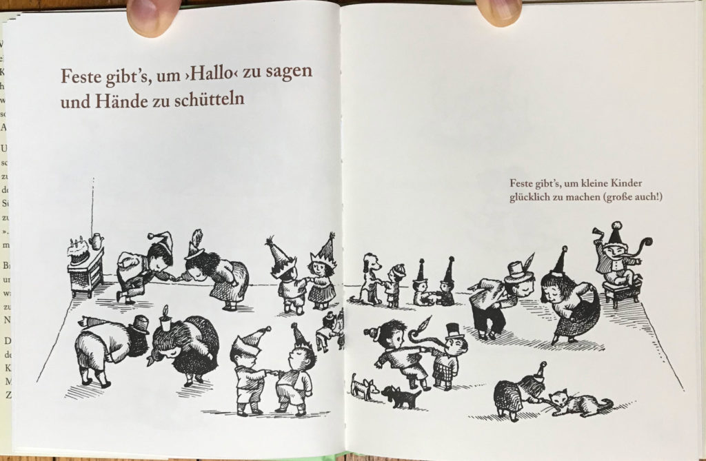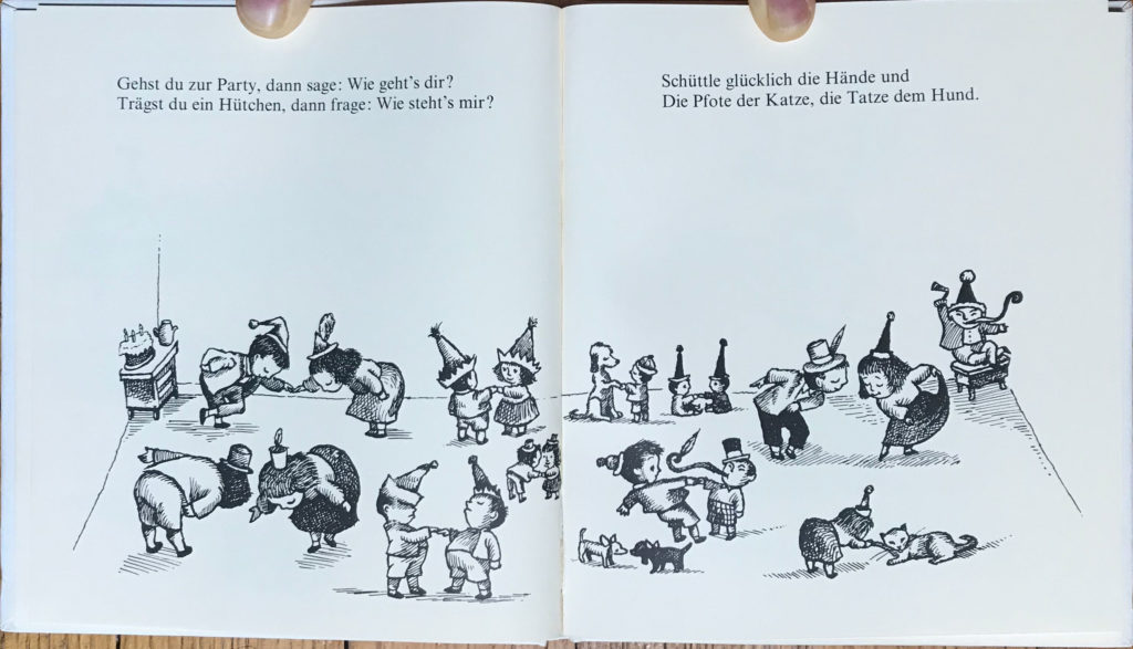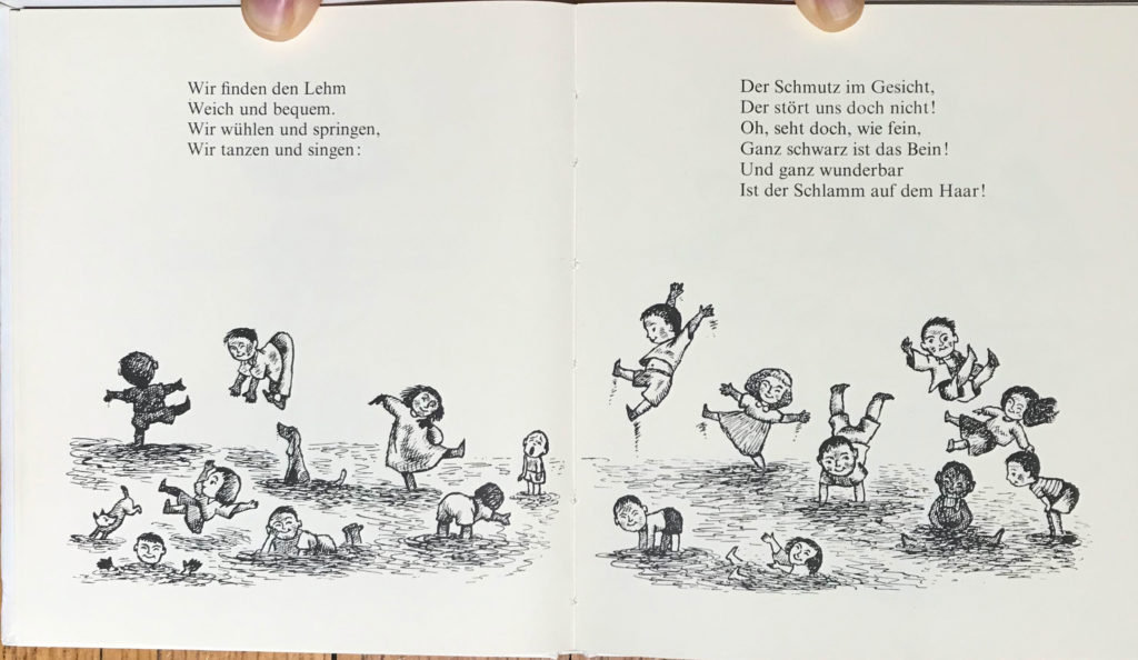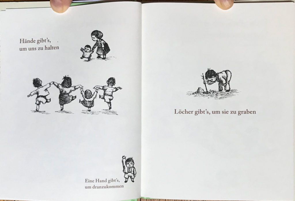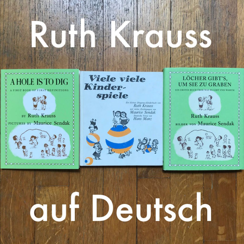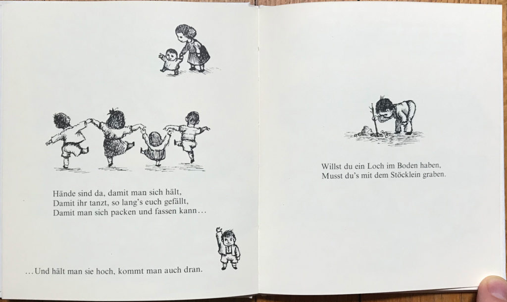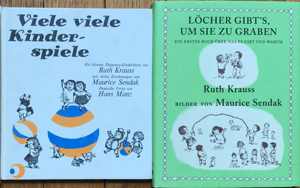 Two different translators had two quite different answers. Hans Manz’s 1968 translation, Viele viele Kinder-spiele, invents new verse that interprets the illustration. Ebi Naumann’s 2016 translation, Löcher gibt’s, um sie zu graben: ein erstes buch über was es gibt und warum strives to render a version of Krauss’s colloquial American text.