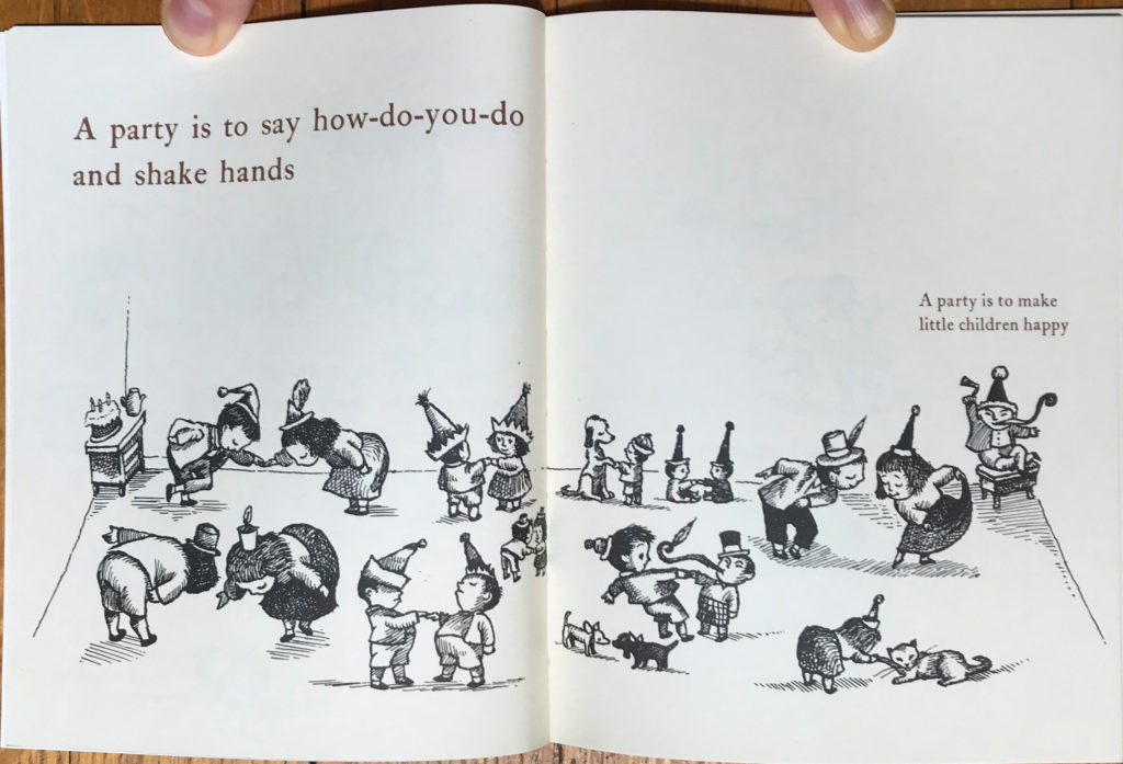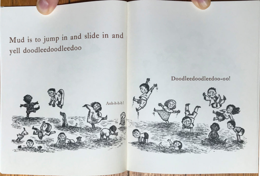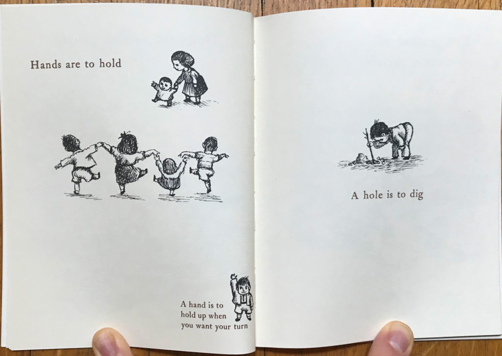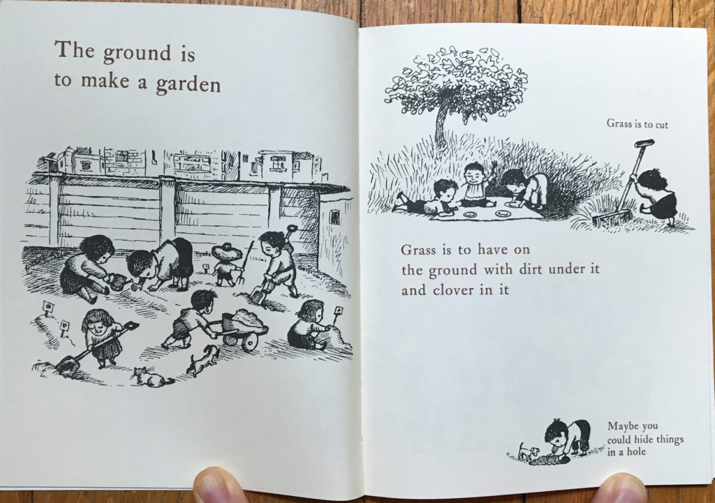 The result is a concept book held together by Sendak’s art and Krauss’s selection and ordering of the definitions. There’s an associative logic to the sequence. On the page before “A hole is to dig,” Krauss offers “Hands are to hold” – the near rhyme of “hole” and “hold” tying them together. On the two-page spread after “A hole is to dig,” she gives us a two-page spread with a series of outdoor activities, including dirt and a hole: “The ground is to make a garden,” “Grass is to cut,” “Grass is to have on the ground with dirt under it and clover in it,” and “Maybe you could hide things in a hole.”