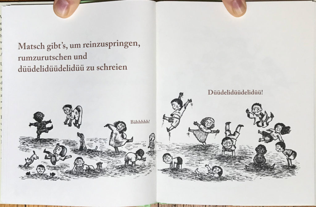 Naumann’s 2016 translation offers a nearly sound-for-sound “doodleedoodleedoodleedoo” in its “düüdelidüüdelidüü,” though it does omit the final “oo” (or “üü”) on the second iteration of the exclamation. The other words are German versions of the English. The verb reinzuspringen is to jump into – a combination of springen (to spring towards) and rein (which can mean many things, but here might signify in one of its adverbial senses of entirely or outright). The verb rumzurutschen is to slide around: rutschen is to skip, to slide, to skid; zu is a preposition meaning to, toward, at; I don’t know how rum functions here. The verb schreien means to scream, to shout, to yell.