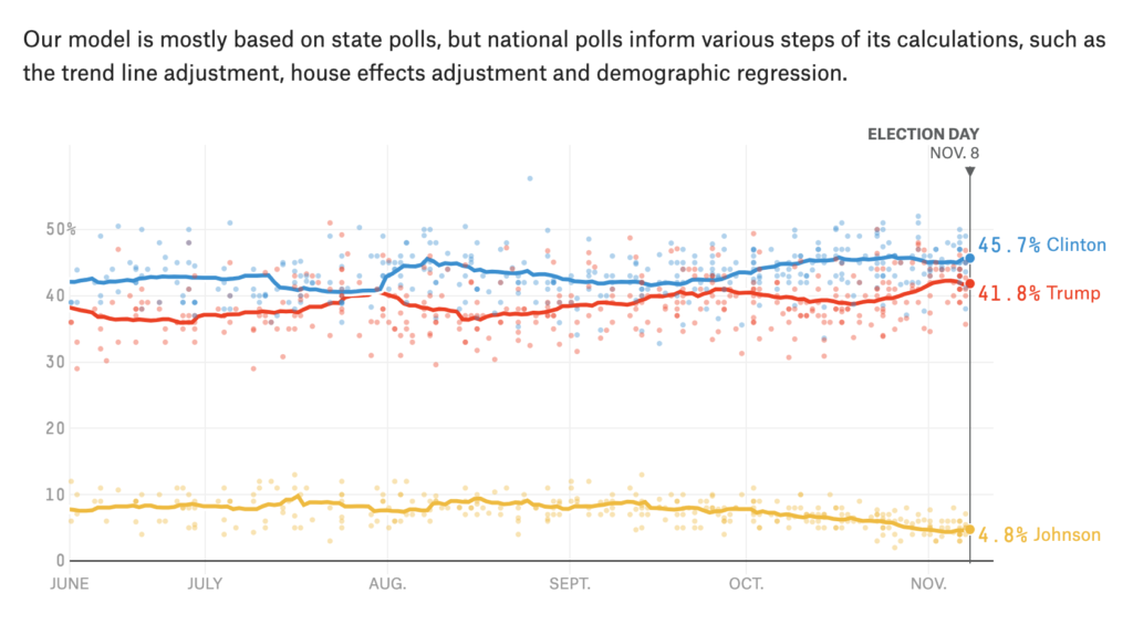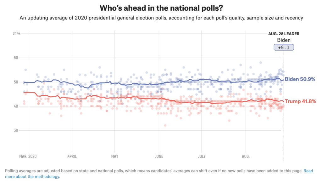 1. Biden – and now Biden-Harris – has been consistently ahead in the polls since at least February. Compare that to 2016, when Clinton’s lead was consistently narrower and Trump was sometimes ahead.
