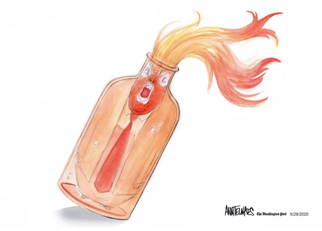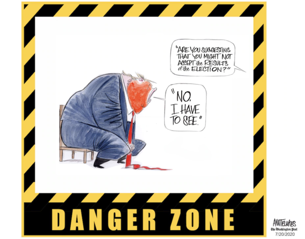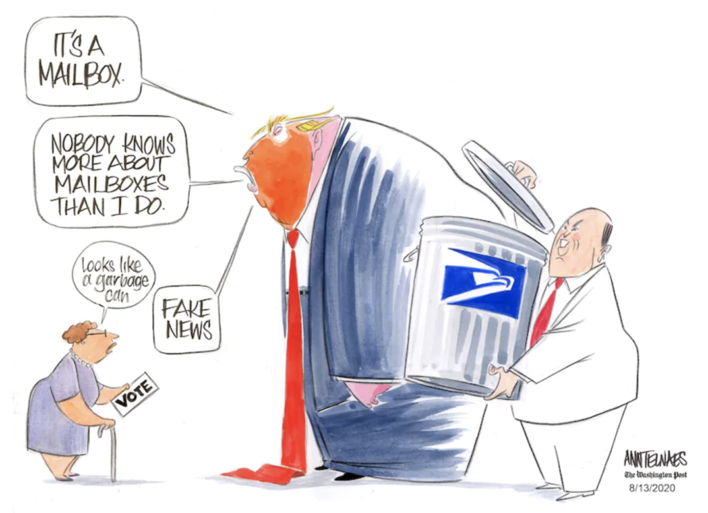 Today, in 2020, we know Trump’s presidency is illegitimate. Afraid that the Republican Party’s voter-suppression efforts will not give him enough of an advantage, Trump is trying to steal another election by appointing saboteur Louis DeJoy to destroy the US Postal Service – in a pandemic, when many will be voting by mail. But his party’s assault on voting rights and his attacks on the USPS delegitimizes any “win” for him: since we know he’s cheating, any claim of “victory” arrives already tainted, suspect, void.