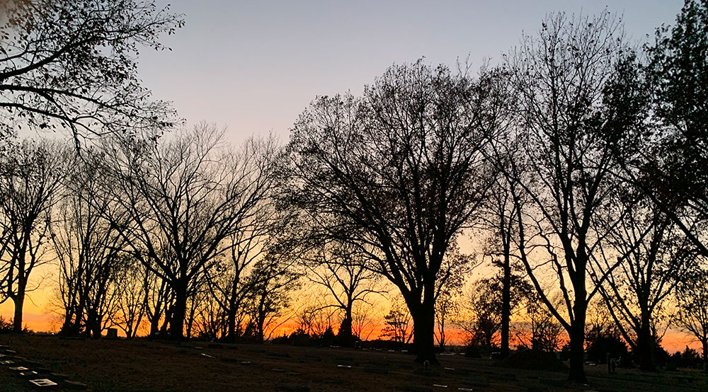 Photo #1: selfie, wearing a Magritte Son of Man mask (made by CoverMyMouth), 14 Nov. 2020. Photo #2: Sunset Cemetery at sunset, Manhattan, Kansas, 17 Nov. 2020.